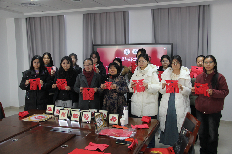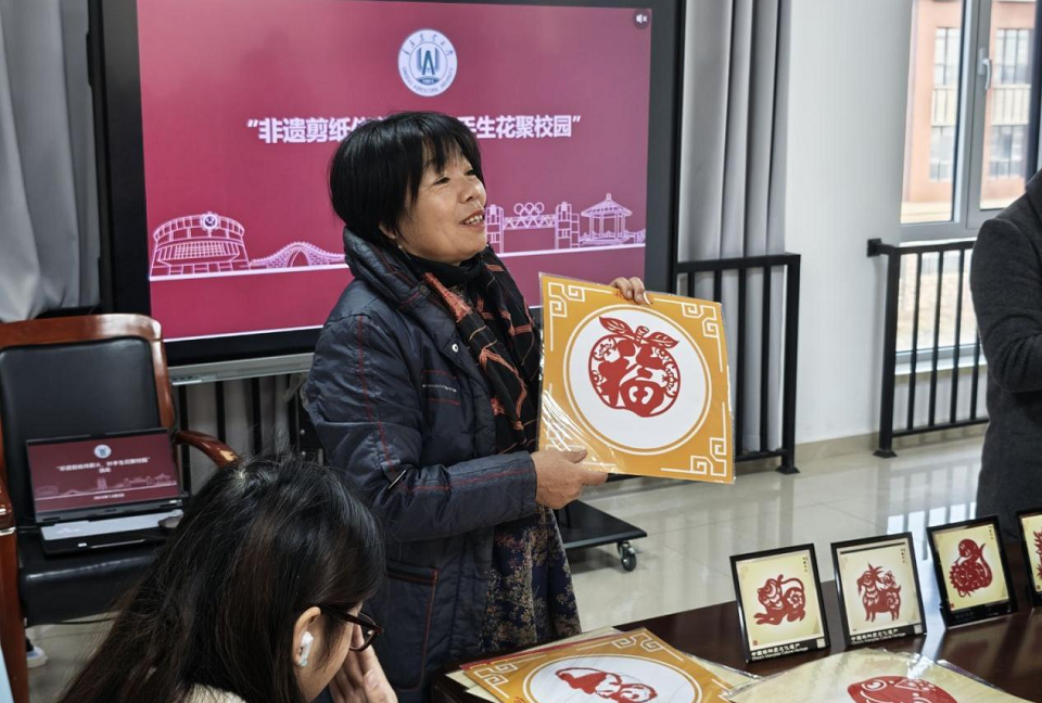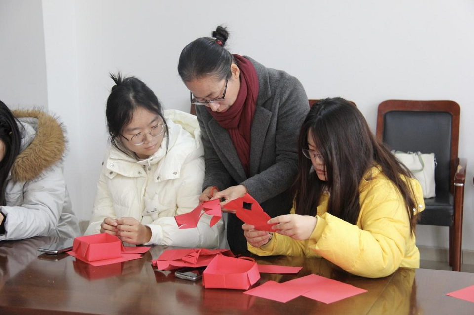 活动现场暖意融融,艺术氛围浓厚。孟祥霞老师为同学们示范了简易纸盒的折叠,引导同学们亲自尝试,让大家直观感受到了手工创作的魅力。修丽娟老师现场展示了精湛的剪纸技艺,她拿起红纸和剪刀,手法稳健流畅,剪刀开合间,纸屑簌簌落下,短短几分钟剪出一幅栩栩如生的蝴蝶,并在翅膀处巧妙融入了莲花等有传统吉祥寓意的图案,线条刻画细腻流畅,纹样设计兼具艺术美感与美好寓意,充分展现出剪纸艺术的精巧构思。