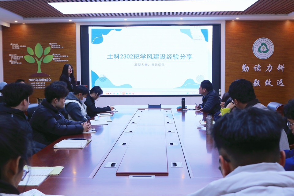 本次培训主要针对2025年秋季学期班级考试、英语四六级考试等学情考情进行综合分析,梳理学风建设中的亮点与不足,并对新学期学风建设有关工作进行指导和部署。会上,宁刚围绕学风建设核心任务,勉励学生干部要强化示范引领、主动担当作为,带动班级形成勤学向上、笃行实干的优良学风。他强调朋辈互助是培育优良学风的重要抓手,向各班级提出“找差距、查根源、重落实、促提升”的工作要求。土科2302班、环科2402班作为优秀班级代表,围绕学习氛围营造、学习小组建设、思想与纪律管理等方面分享实践经验,为各班级学风建设提供了切实可行的参考思路。