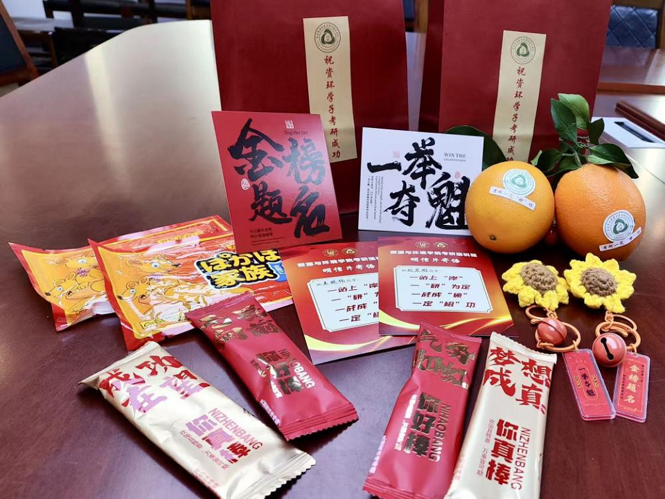 最后,老师们为学生送上了学院精心准备的考研加油包,其中包含橙子、向日葵挂饰、定制明信片、暖贴等,寓意着考研学子一定“橙”功、一举夺“葵”,每一份物品都饱含着学院对考研学子的深切关怀与美好期许。学院老师及各专业的学弟学妹们也以视频的形式送来祝福,为他们加油鼓劲,祝愿他们在考研征程中奋勇向前,成功上岸。