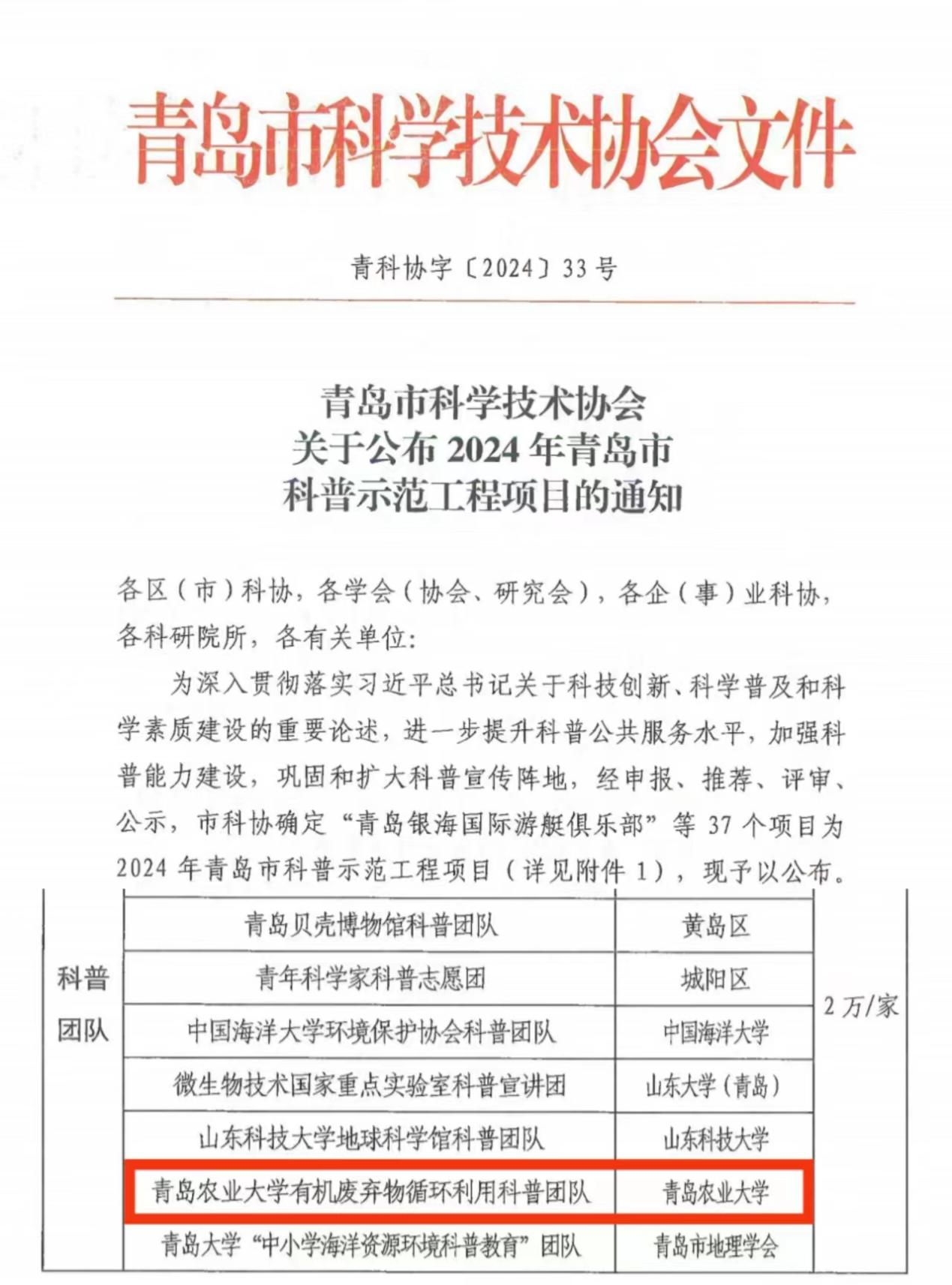 近日,青岛市科学技术协会发布了《青岛市科学技术协会关于公布2024年青岛市科普示范工程项目的通知》(青科协字〔2024〕33号),公布了2024年青岛市科普示范工程项目立项审批结果。由英国365上市公司张小梅副教授主持申报的《365上市公司有机废弃物循环利用科普团队》项目成功获批立项,该项目也是学校唯一一支获批立项团队,为学校科普教育注入了新的活力。