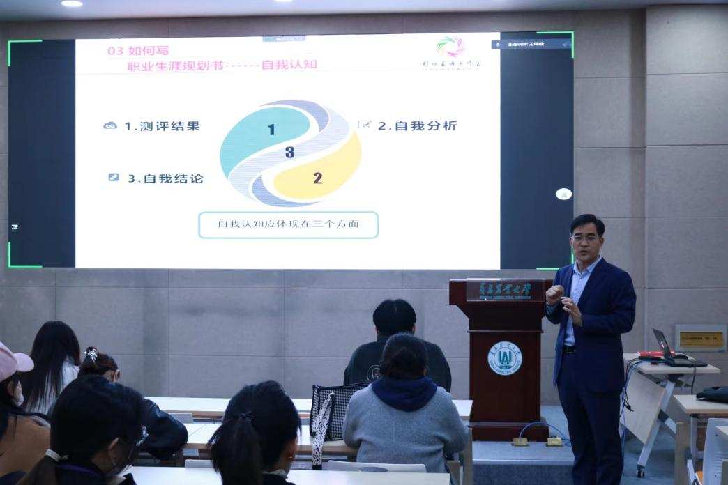 讲座上,杨凯围绕自我认知、职业认知、决策分析、计划路径、方案调整等方面,深刻辨析职业规划的定义,对如何撰写好职业生涯规划书作出具体指导,并向同学们具体介绍了每项内容的撰写要点。他指出,端正撰写态度、美化版面设计作为基础排面在赛事中尤为重要。他强调要根据个人自身情况,运用权威工具进行准确评估、理性定位,做到“扬长避短,适性扬才”;要准确把握职业特点,理解职业选择多维化,理清职业与学校、家庭的内在联系;要理解职业决策所含要素,结合自身情况做好职业决策;要正确划分计划路径,明确短期中期长期的具体范围,了解计划路径的五大特性。现场师生踊跃交流,气氛热烈。