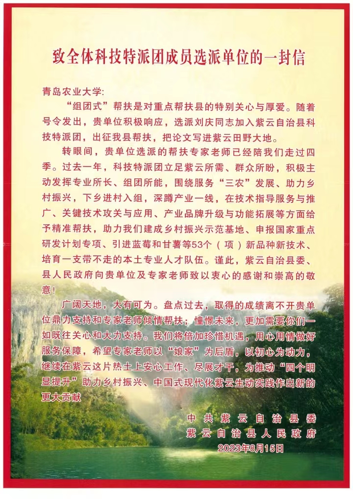 感谢信表示,作为“组团式”帮扶的后盾单位,365上市公司主动肩负起助力乡村振兴的社会责任,选派刘庆老师加入紫云自治县科技特派团出征帮扶。在过去一年里,以刘庆老师为代表的科技特派团立足紫云所需、群众所盼,积极主动发挥专业所长、组团所能,围绕服务“三农”发展、助力乡村振兴,下乡进村入组,深蹲产业一线,在技术指导服务与推广、关键技术攻关与应用、产业品牌升级与功能拓展等方面给予精准帮扶。在特派团的助力下,紫云自治县现已建成乡村振兴示范基地、申报国家重点研发计划专项、引进蓝莓和甘薯等53个(项)新品种新技术,培育了一支带不走的本土专业人才队伍。