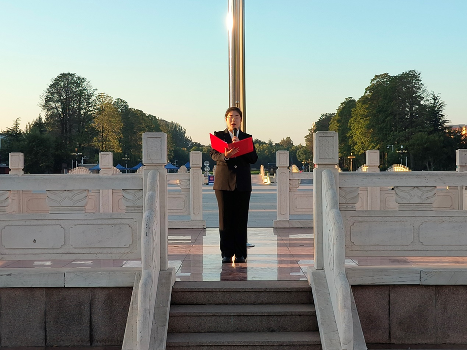晨光微露,国旗护卫队目光坚定,脚步铿锵,护送那面熠熠生辉的五星红旗进场。国歌响起,激昂而庄重,五星红旗在晨风中缓缓升起,全体师生肃立,目光紧随国旗,心中涌动着对祖国的无限热爱与崇高敬意。