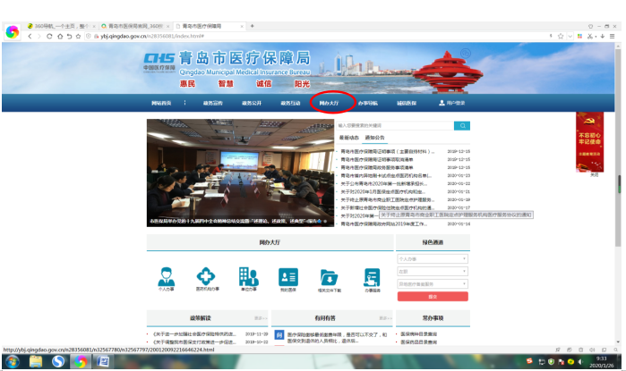 1.登录青岛市医疗保障局官网(http://ybj.qingdao.gov.cn),点击“网办大厅”。