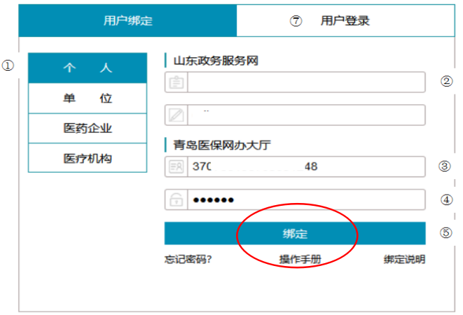 3.在“青岛医保网办大厅”下,填写身份证、密码信息,点击“绑定”。